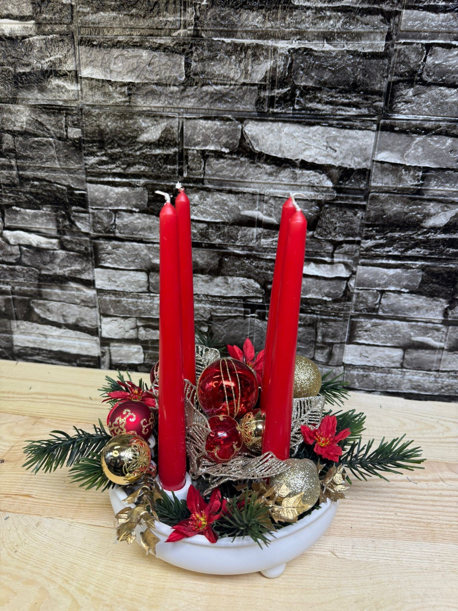 Der Kranz ist mit künstlichen Produkten gestaltet, weshalb er jedes Jahr wieder verwendet werden kann.